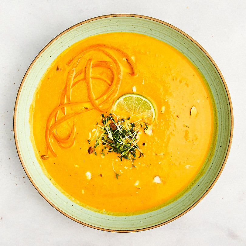 La gustosa zuppa biologica di carote di Froyda è arricchita con cocco, patate dolci e zenzero. È cremosa con una nota di sapore dolce e speziata.